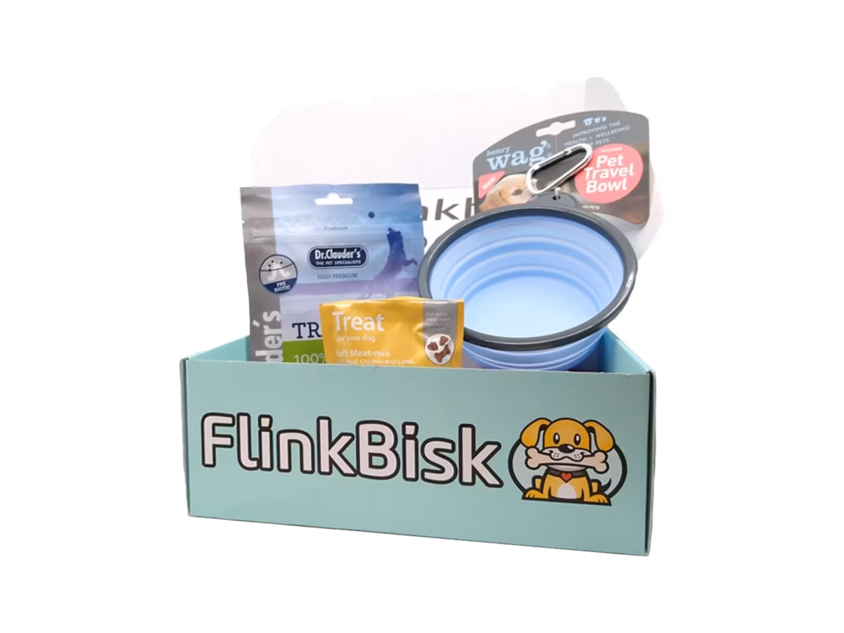 Her kan du få en FlinkBisk belønningsboks til hunden din, når du blir abonnent uten bindingstid. Den inneholder spennende ting som hundeleke, snacks, belønningsbiter og mer.